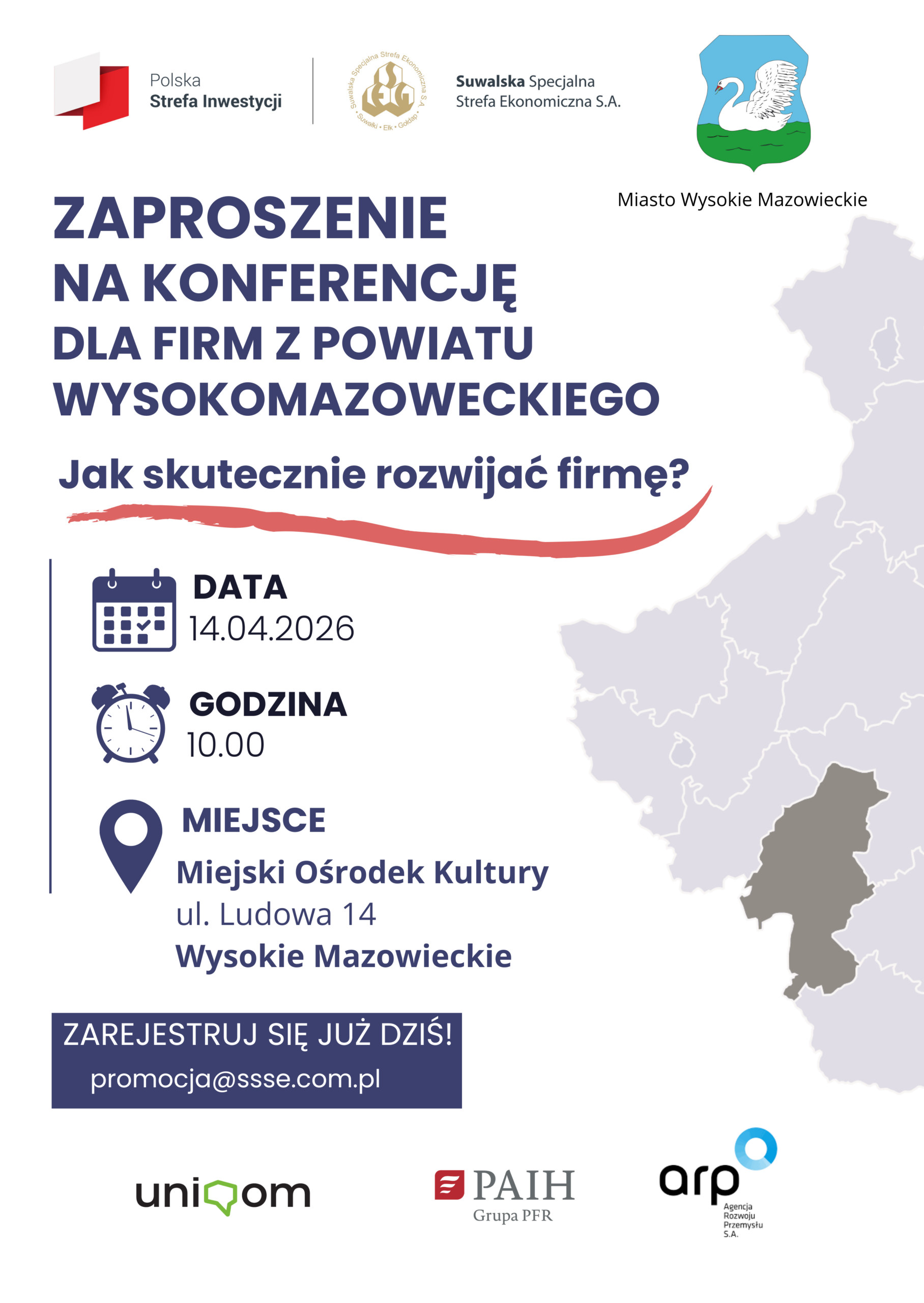 Zapraszam na bezpłatną konferencję organizowaną przez Suwalską Specjalną Strefę Ekonomiczną. Celem wydarzenia jest przedstawienie możliwości, jakie oferuje Polska Strefa Inwestycji – rządowy program wspierający rozwój przedsiębiorstw. W ramach programu przedsiębiorcy