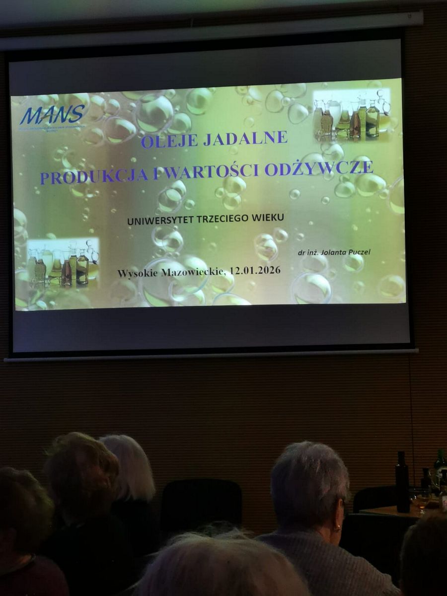12.01.2026 r. wysłuchaliśmy bardzo interesującego  i pouczającego wykładu dr Jolanty Puczel z Międzynarodowej Akademii Nauk Stosowanych w Łomży pt. „Oleje jadalne, produkcja i wartości odżywcze.”